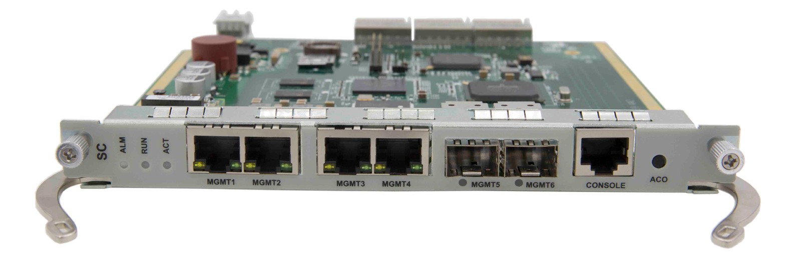 SC板卡是针对OTNW9800机框设计的主控卡,支持背板,电源,风扇,线卡的状态管理及业务配置,支持本地(串口)及远程登入(telnet/ssh)维护管理,支持SNMP V2C通用网络管理接口,支持trap告警上报,支持电口/光口灵活组网管理。